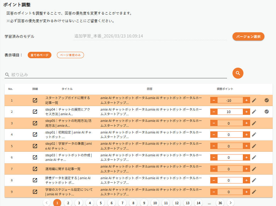 ポイント調整画面では、回答のポイントを調整することで、回答の優先度を強制的に変更することができます。