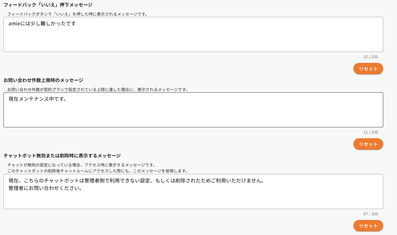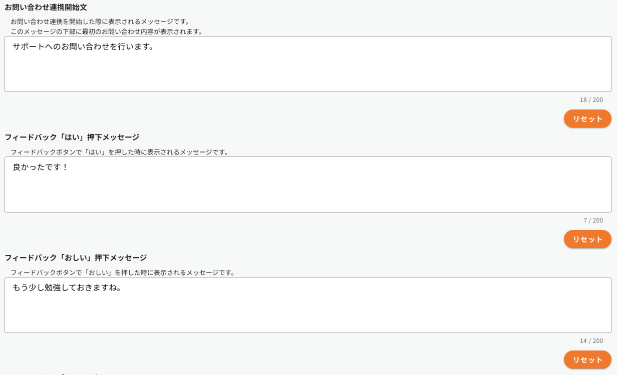 チャットボットが回答できなかった場合に表示するメッセージやURLを設定します。 - 長文時のお問い合わせ先