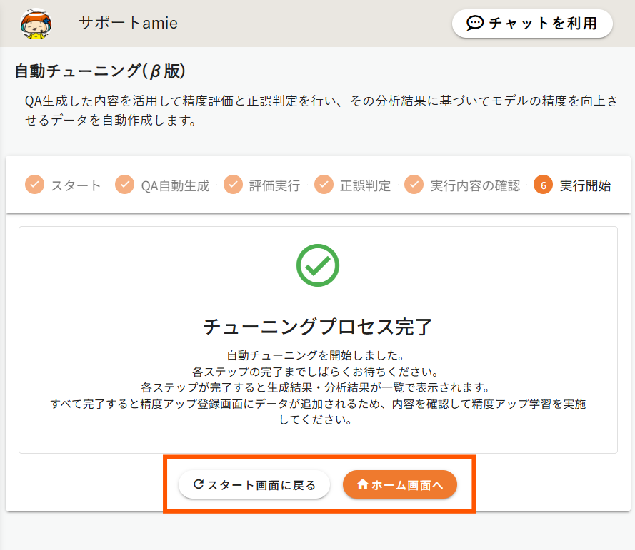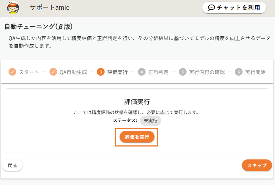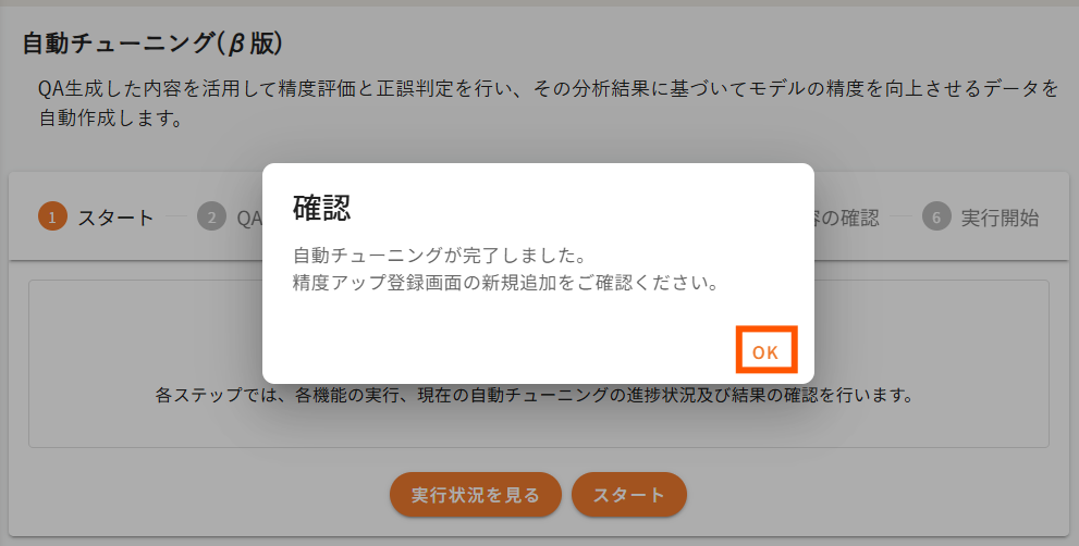 自動チューニングとは、QA生成した内容を活用して精度評価と正誤判定を行い、その分析結果に基づいてモデルの精度を向上させるデータを自動作成する機能です。
