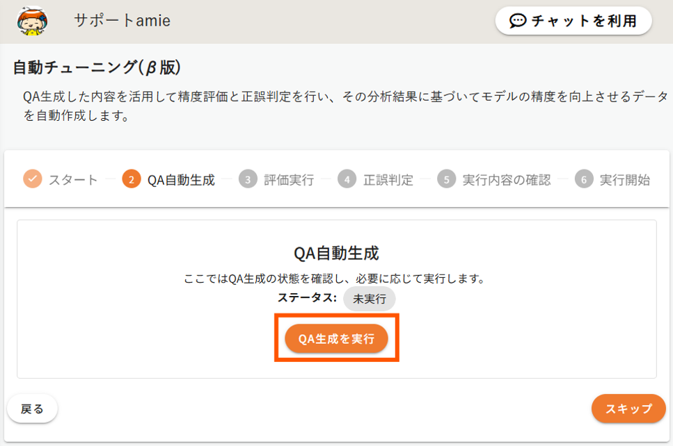 - 「QA生成を実行」をクリックすると、右下が「スキップ」から「次へ」に切り替わりますので、「次へ」をクリックしてください。