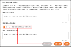 ③「チャット画面で類似質問として表示する」のチェックをオフにして、「更新」ボタンをクリックします。