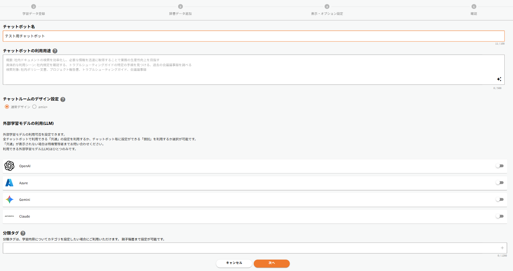 ※「OpenAI」と「Azure」は、設定画面とチャット作成画面STEP1/基本設定画面でLLMの設定をオンにしている場合のみ表示されます。