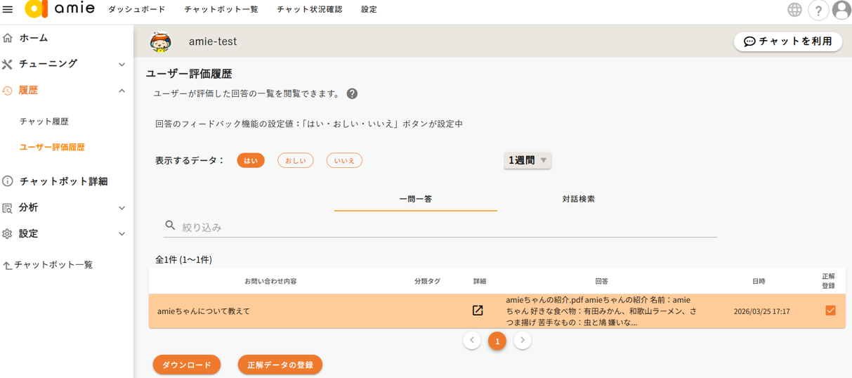 左側のメニューの 「履歴管理」→ 「ユーザー評価一覧」をクリックすると、チャット利用者から「回答のフィードバック機能」のフィードバックに反応した一覧が確認できます。