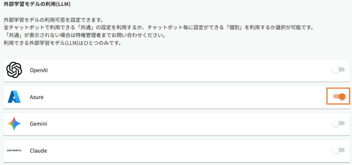 - 「外部学習モデルの利用(LLM)」のトグルを「ON」にします。