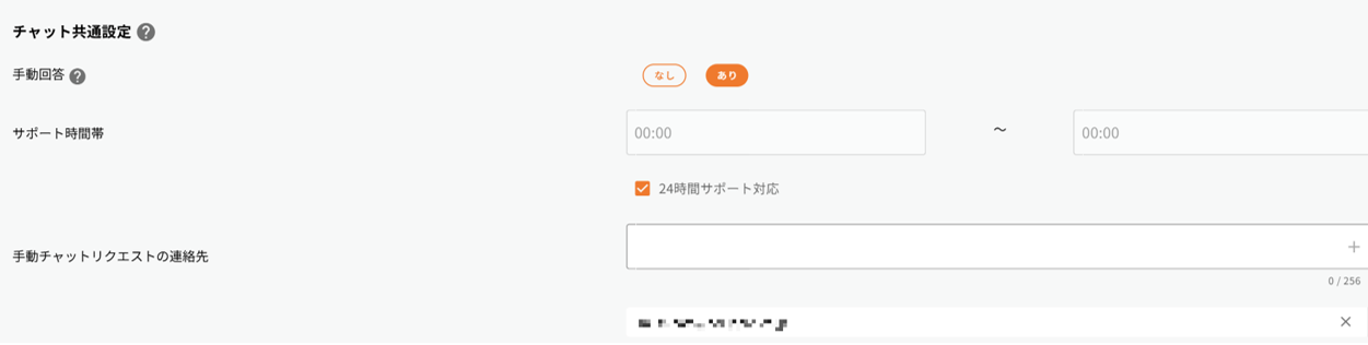 ※24時間サポート対応 のチェックをオフにすると、有人チャットを受け付ける時間帯を指定できます。 - 手動チャットリクエストの連絡先 ・・・ チャット画面からオペレータを呼び出した際に、メール通知する連絡先を設定します。