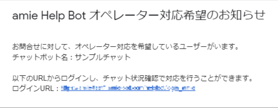 1. チャット利用者からオペレーターの呼び出しが行われると、「設定」の「手動チャットリクエストの連絡先」で指定したメールアドレスに、「オペレーター対応希望のお知らせ」というメールが通知されます。