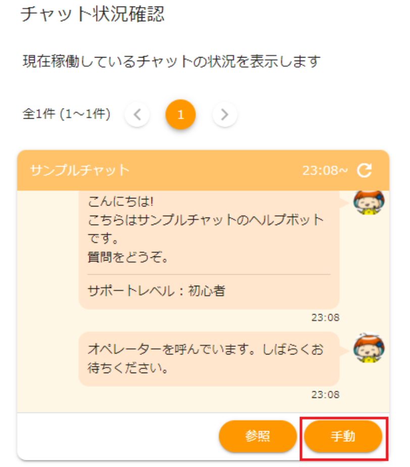 2. 管理画面にログインし、「チャット状況確認」をクリックすると、有人チャットを希望しているチャットウィンドウが点滅しているので、「手動」をクリックして、有人チャットを開始します。
