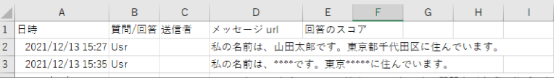 左側のメニューから、「設定」→「基本設定」→「個人情報マスク設定」で「データベース」を 「マスクあり」 に設定した場合、左側のメニューの「チャット履歴」からダウンロードしたCSVファイルの情報をマスク化することができます。