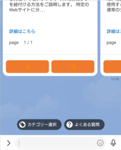 ・チャットで質問を行うと、画面下に「カテゴリ―選択」と「よくある質問」が表示されます。