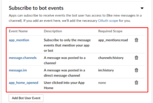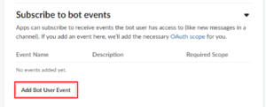 - 画面をスクロールし、「Subscribe to bot events」をクリックし、「Add Bot User Event」をクリックします。プルダウンメニューから以下の4つを追加します。