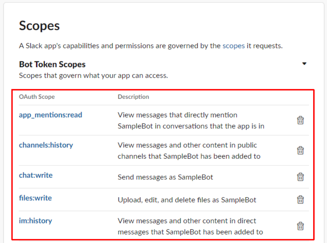 - 「Scopes」内の「Bot Token Scopes」をクリックし、「Add an OAuth Scope」をクリックし、プルダウンメニューから以下の5つを追加します。