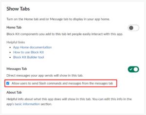 - 画面を少しスクロールし、「Show Tabs」欄の「Allow users to send Slach commands and messages from the messages tab」にチェックを付けます。