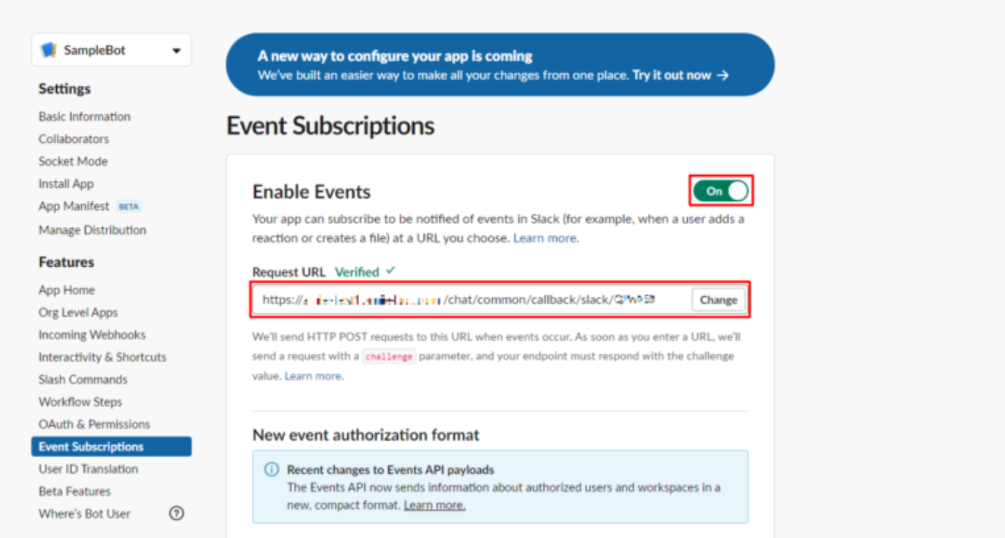 「Enable Events」のトグルを「On」にし、「Request URL」に手順16でコピーしたWebhook URLを貼り付けます。