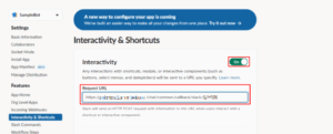 - 左側のメニューの「Interactivity & Shortcuts」をクリックします。「Interactivity」のトグルを「On」にし、「Request URL」に手順16でコピーしたWebhook URLを貼り付けます。
