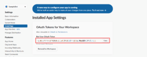 - 「Installed App Settings」画面にて、「Bot User OAuth Token」に記載されている内容をコピーし、メモ帳などに控えておきます。