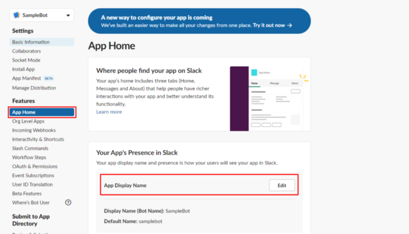 - 左側のメニューの「App Home」をクリックし、「App Display Name」欄の「Edit」をクリックします。