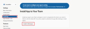 - 左側のメニューから、「Install App」をクリックし、「Install App to Your Team」画面にて「Install to Workspace」をクリックします。