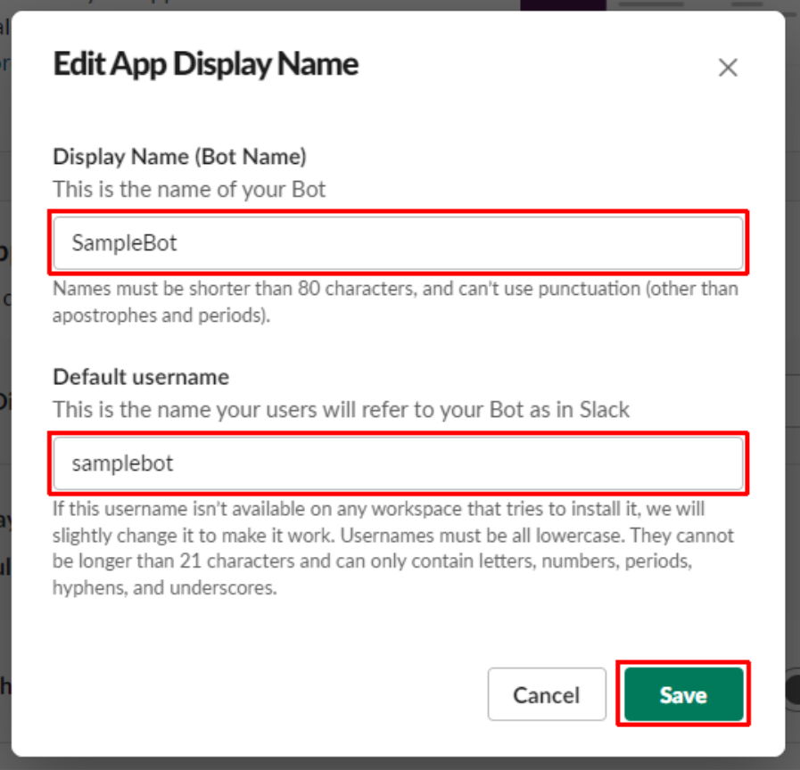 - 「Edit App Display Name」画面にて、「Display Name (Bot Name)」に表示名(日本語可)、「Default username」にユーザー名(※小文字英語のみ)を入力し、「Save」をクリックします。