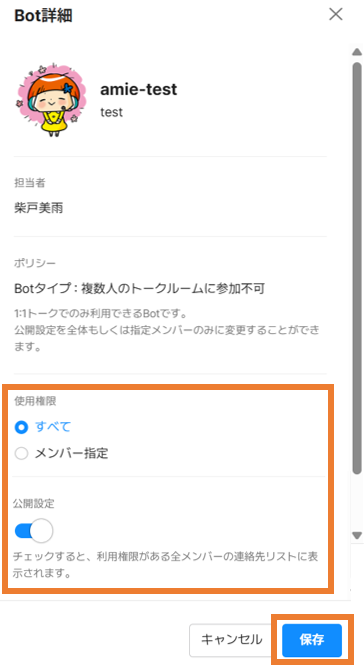 - 「使用権限」で対象ユーザーの設定をし、「公開設定」をONにして「保存」をクリックします。