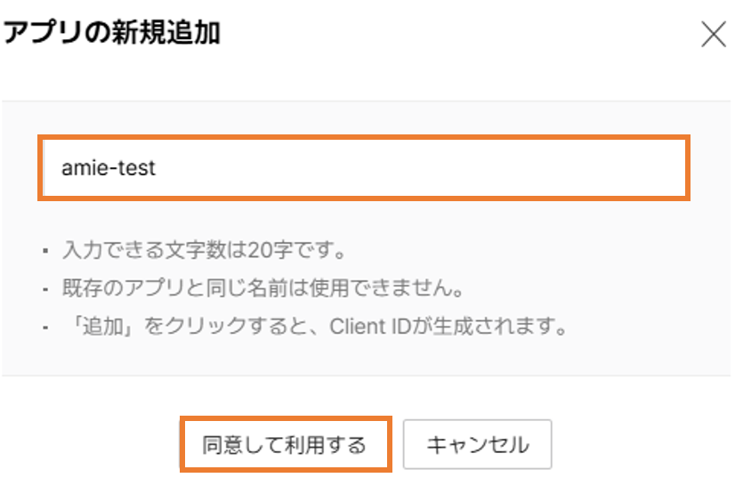 - 「アプリの新規追加」ダイアログで任意のアプリ名を入力し、「同意して利用する」をクリックします。