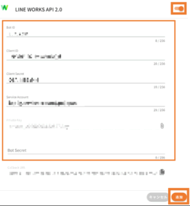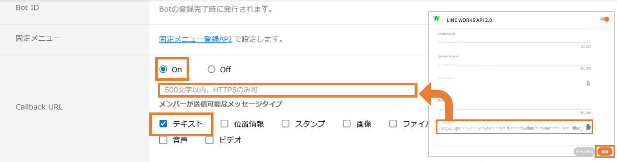 - 「callback URL」は「On」を選択し、連携する「amie」のチャットボットのLINE WORKS画面に表示されているCallback URLをコピー&ペーストしてください。