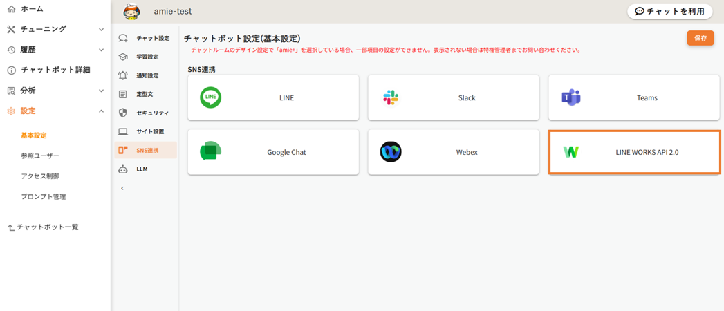 - amieチャットボットを開き、左側の「設定」→「基本設定」→「SNS連携」を選択します。