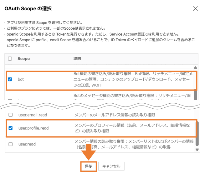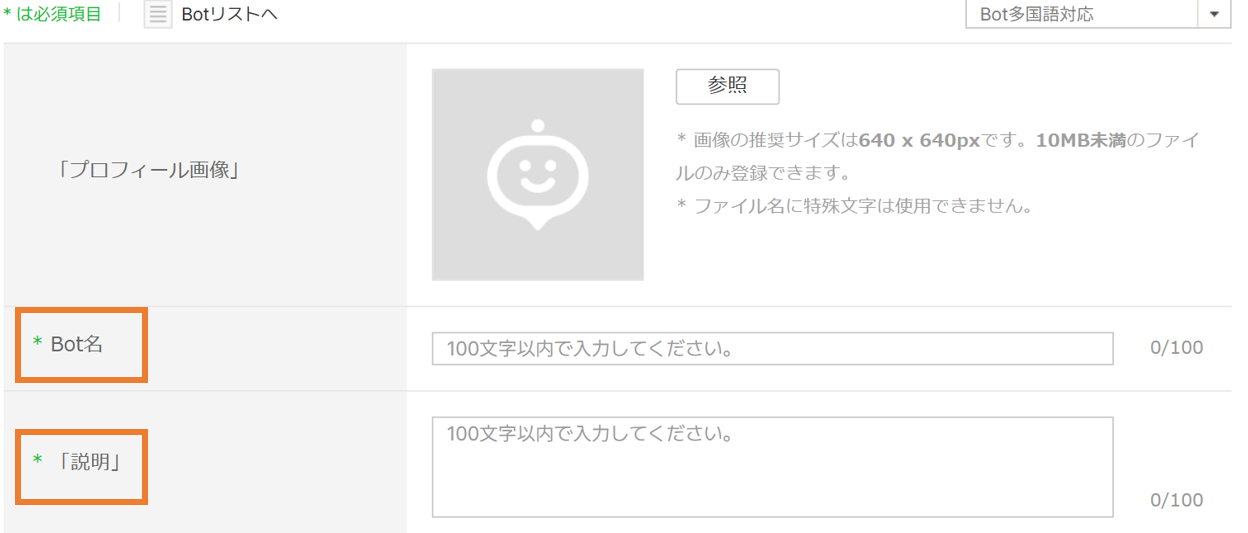 - 「プロフィール画像」、「Bot名」、「説明」は任意の値を入力します。