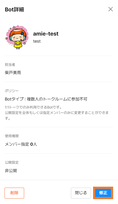 - Botを選択し、Bot詳細画面で「修正」をクリックします。