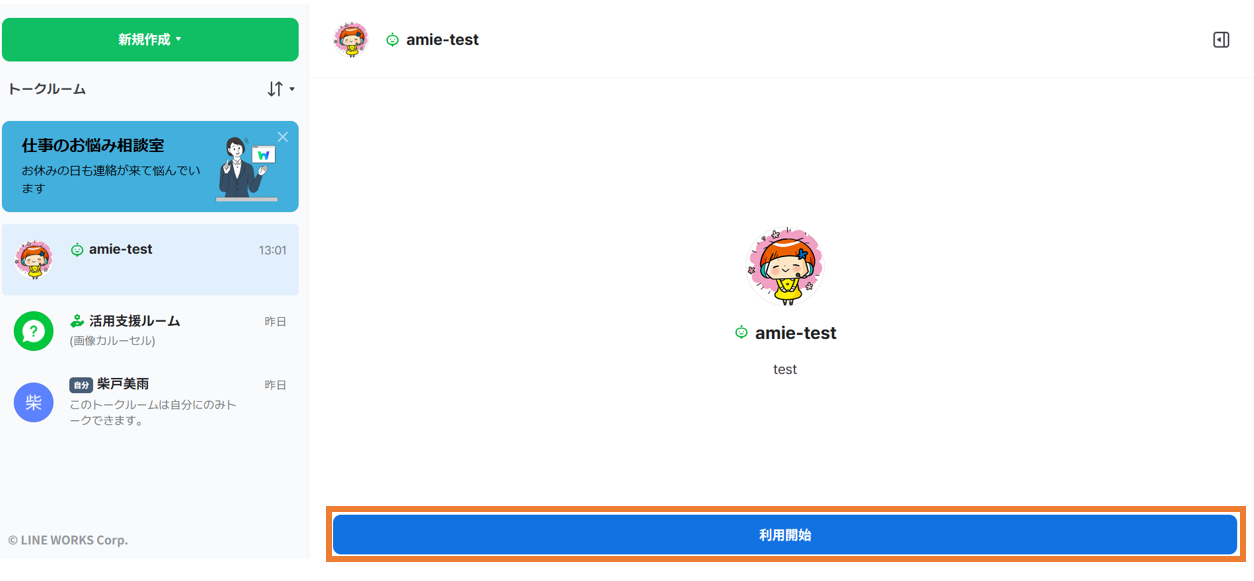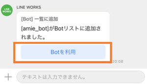 ※メンバーを含管理者に設定する前に招待した場合は、招待通知が来ないため、その場合は非公開→公開の作業を行うことで再度招待通知ができます。 - 対象ユーザーのLINE WORKSに通知が来るので、「Botを利用」をクリックするとチャットが開始できます。
