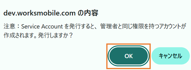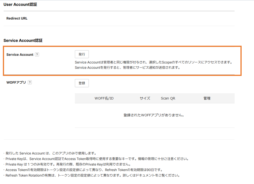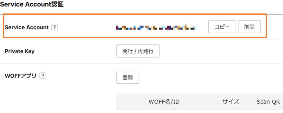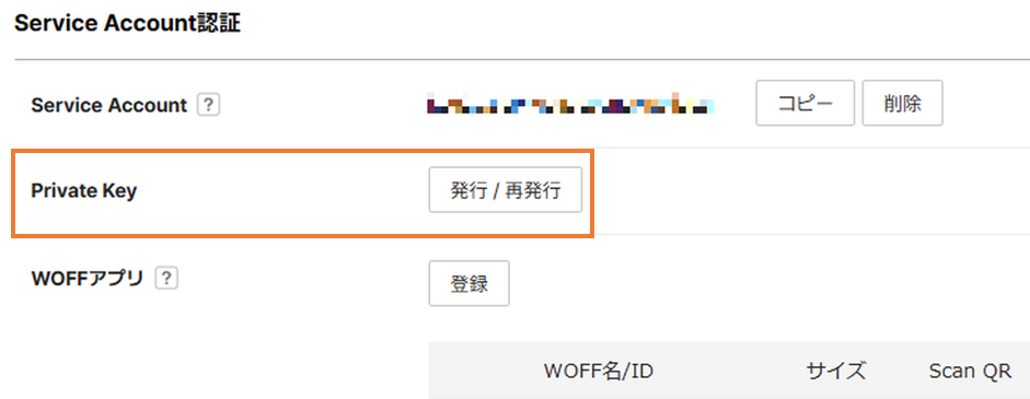 - 「service Account 認証」欄にある「saervice Account」より「発行」をクリックします。