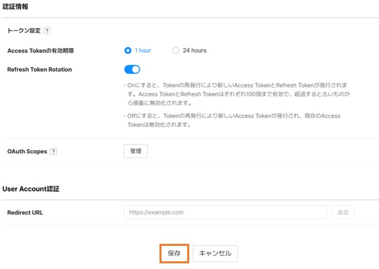 - 「認証情報」にて「OAuth Scopes」の「管理」ボタンをクリックします。