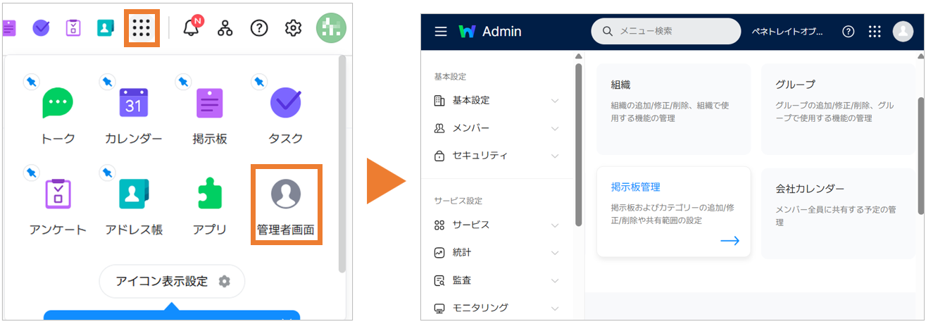 LINE WORKS連携が使えるようになっているか、ご確認ください。