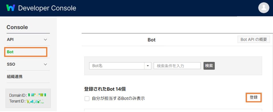 - 左の「Bot」メニューをクリックし、「登録」をクリックします