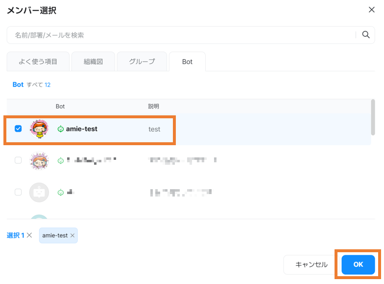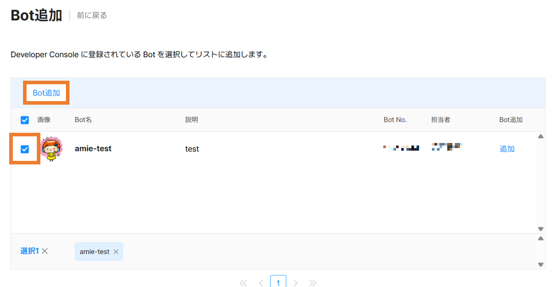 - 作成したBotが表示されるので、選択して「Bot追加」もしくは「追加」をクリックします。