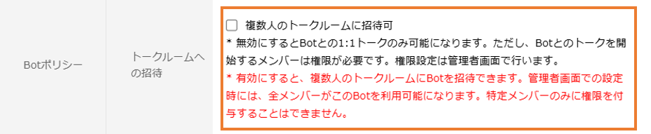 また、「メンバーが可能なメッセージタイプ」は「テキスト」にチェックを入れてください。 - 「Botポリシー」にて「複数人のトークルームに招待可」は、1対1なので、チェックを入れないでください。