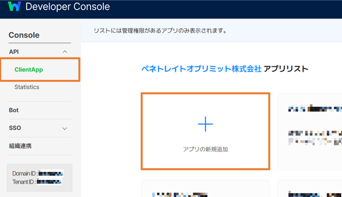 - 左側のメニューバーより、「API」-「ClientApp」をクリックし、アプリリスト画面で、「アプリの新規追加」をクリックします。