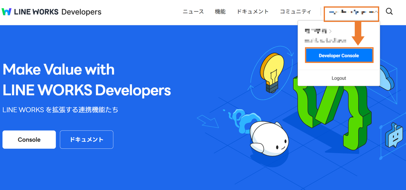 https://developers.worksmobile.com/jp/?lang=ja - ログインが完了したら右上の「Developer Console」をクリックします。