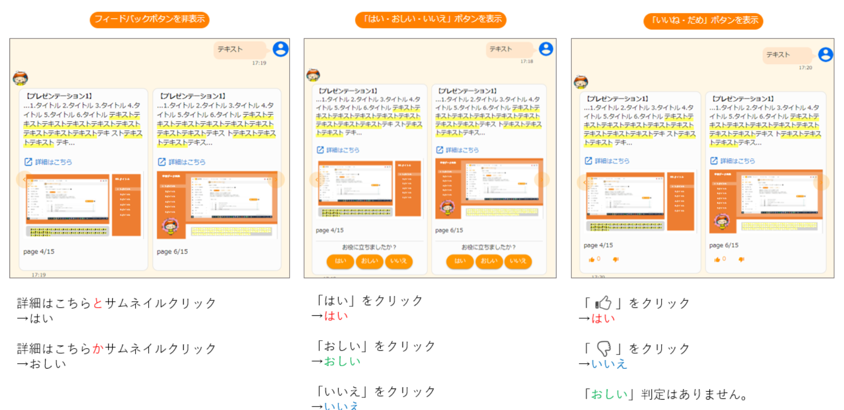 フィードバック機能は、チャットボットごとに以下の4つから表示を選べますが、チャット画面から、「回答のフィードバック機能」のボタンをクリックした際に付与されるポイントが各表示機能によって異なります。