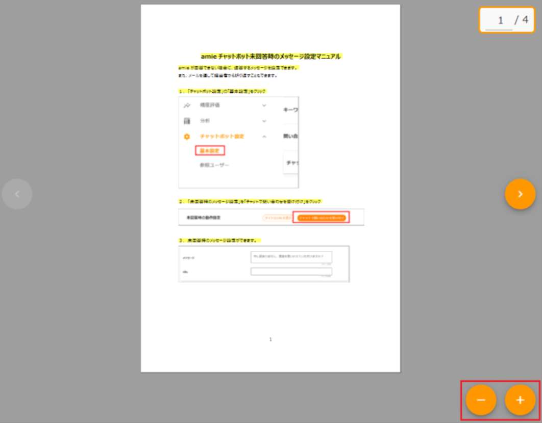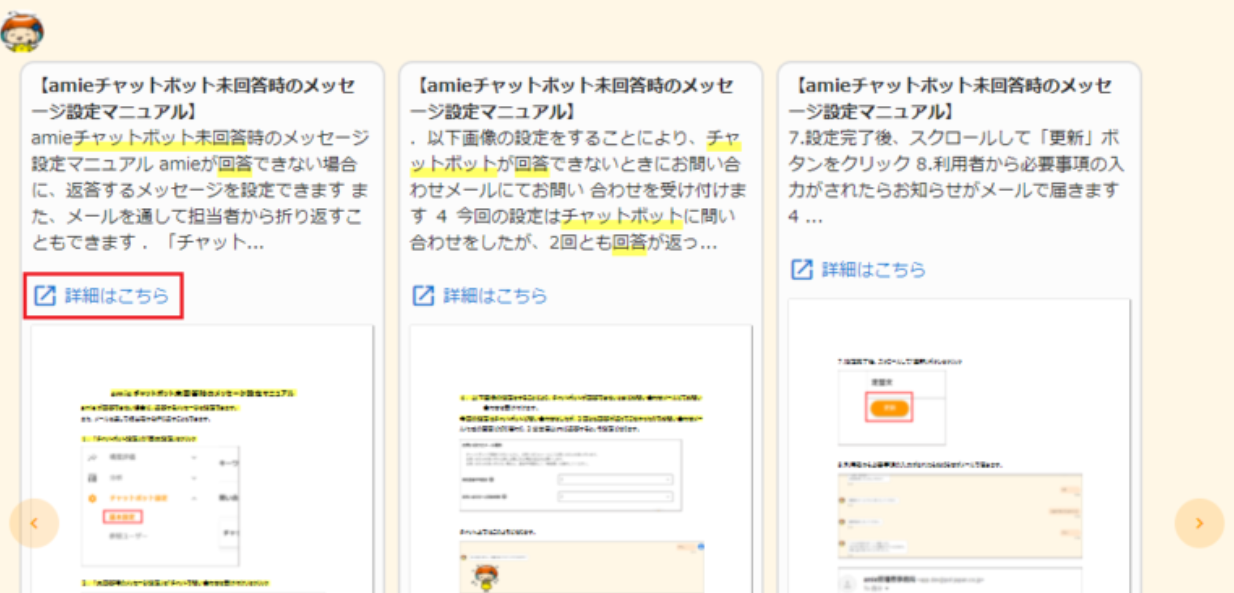 チャット画面で質問を行い、マニュアルが含まれる回答が表示された場合、「詳細はこちら」 のリンクをクリックするとマニュアルが別タブで表示されます。