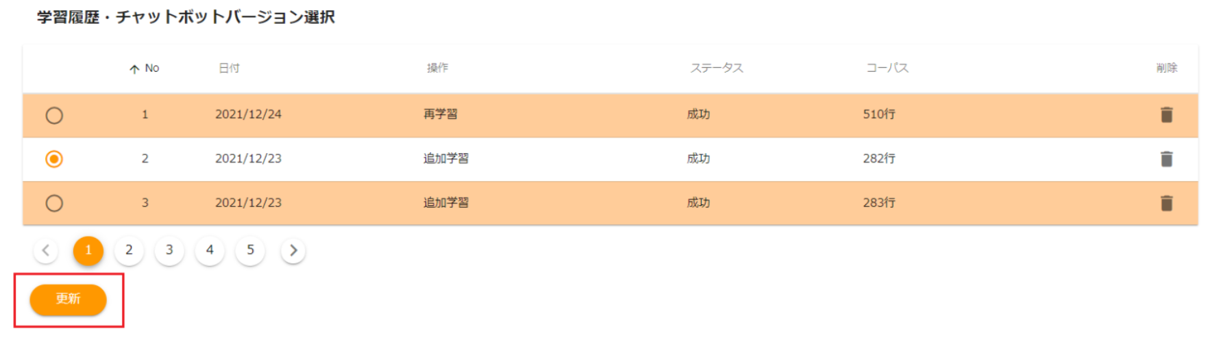 - 「学習履歴・チャットボットバージョン選択」から戻したいチャットボットを選択し、「更新」をクリックします。