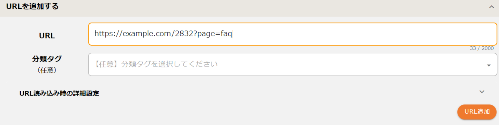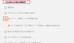 「?」が含まれるWebサイトを学習する場合、学習時の「URL読み込み時の詳細設定」にて、「URLに「?」を含むリンクを学習に含む」をオンにして学習することで、正しくURLを学習することができます。