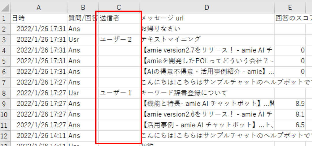 - ダウンロードした amie_history.csv を開き、C列の「送信者」にてユーザーを確認します。