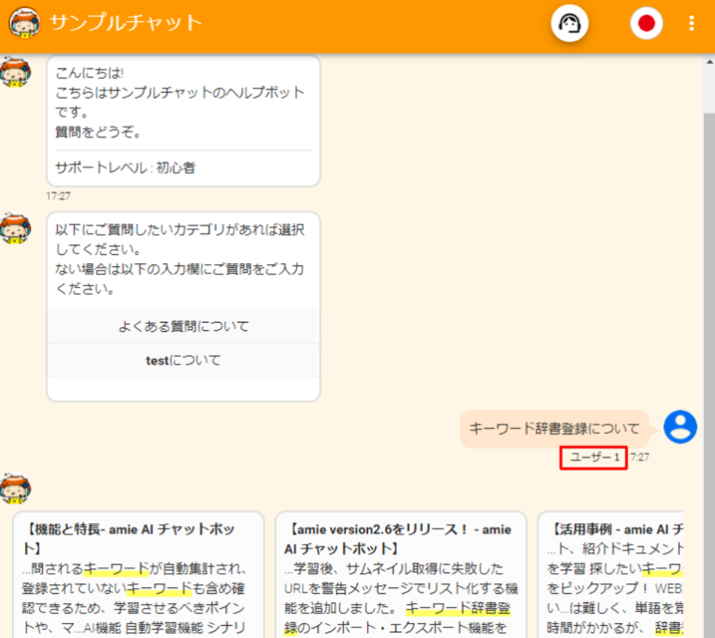 運用上、誰がチャットを利用したか確認したい場合は、チャット画面を起動時にユーザー名を入力してから質問するようにしていただくことで、チャット履歴から利用ユーザーを確認することができます。