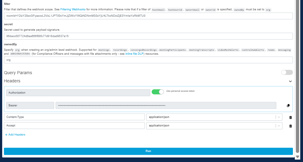 「Use personal access token」のトグルをオフにし、Bearer欄に「Webex 連携の設定」ー手順4 で控えた Bot access tokenを入力します。