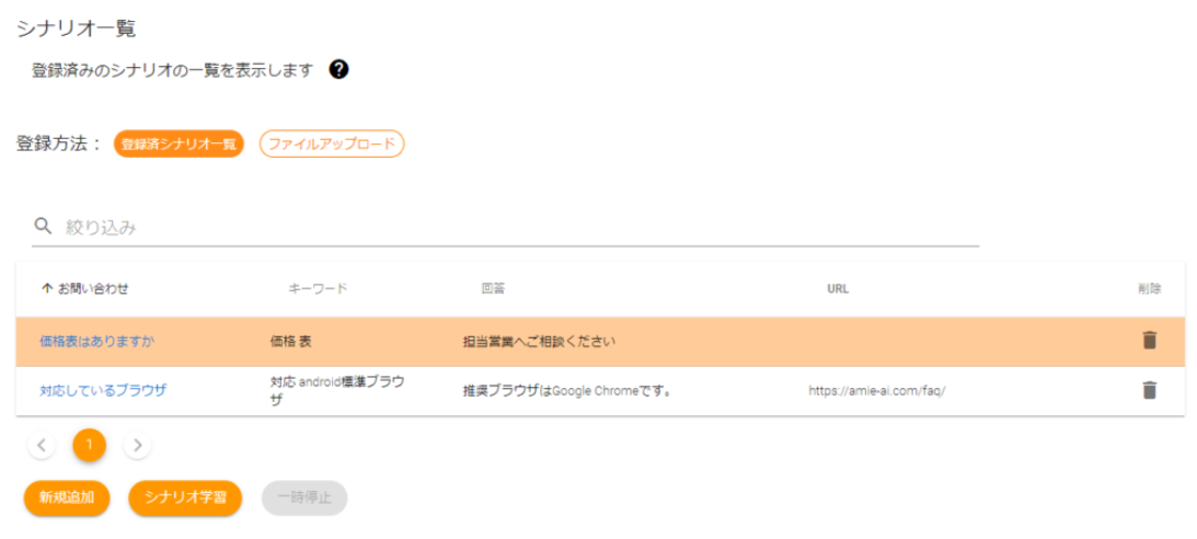 学習データには含まれない質問と回答を、シナリオとして登録しておくことで、質問した際にシナリオの回答を表示します。