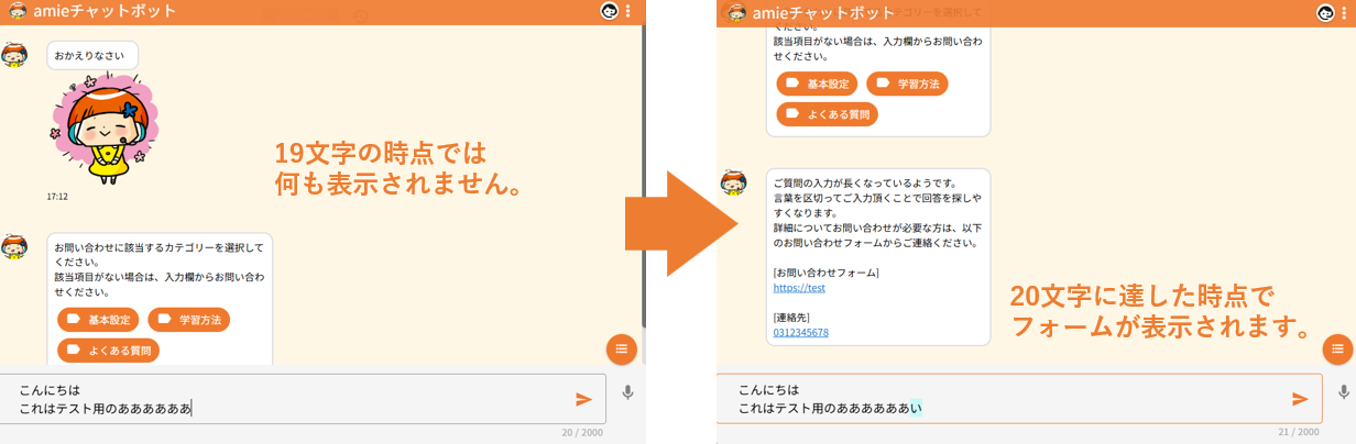 チャット画面にて、質問が長文の場合に、文字数を超えた時点で、強制的にお問い合わせフォームを表示することが可能です。