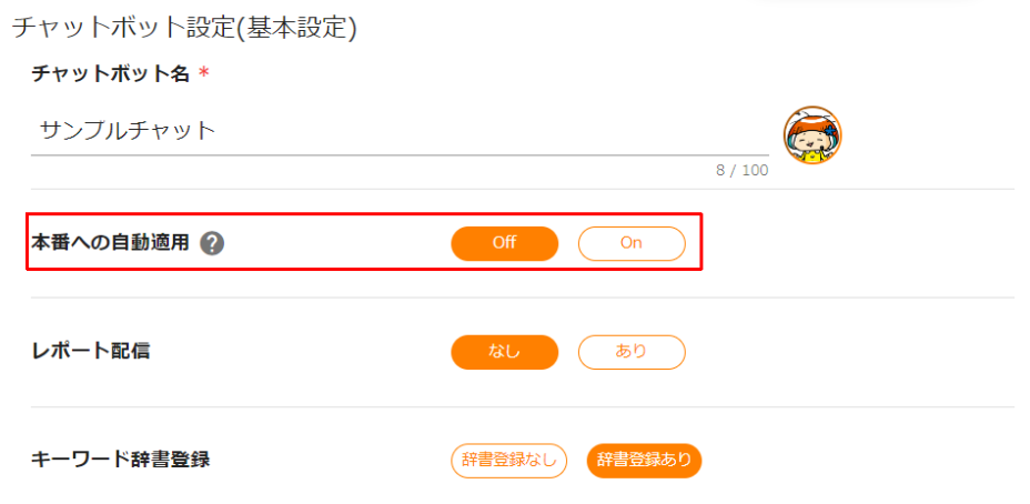既存のチャットボットの自動適用の設定を変更する場合は、左側のメニューの「設定」>「基本設定」から変更可能です。