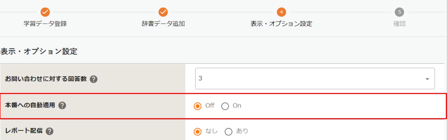 初回学習時に自動適用をOnにする場合は、「表示・オプション設定」画面にて変更します。