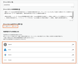 Step1の画面で「外部学習モデルの利用(LLM)」の設定を行うと、「生成AIエンジン」として「amie LLM」以外に設定したLLMによって「OpenAI」「Azure」「Gemini」「Claude」を選択できるようになります。