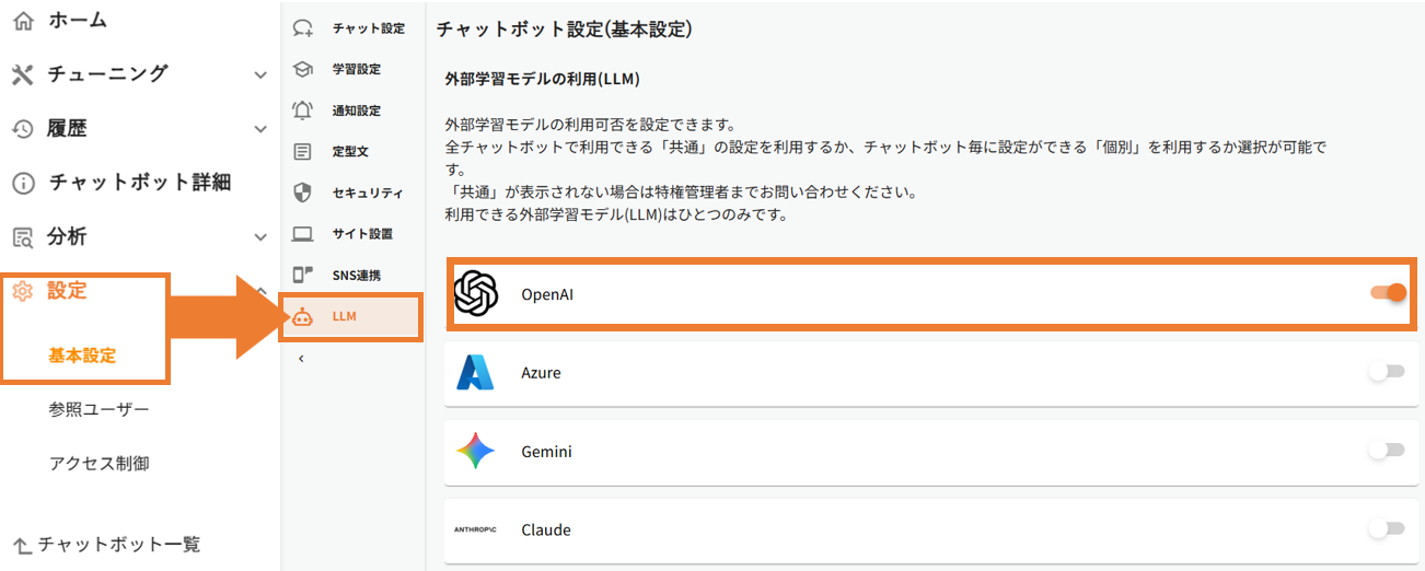 3.「基本設定」→「LLM」から、「外部学習モデルの利用(LLM)」で使用するAIを選択し、トグルをオンにします。